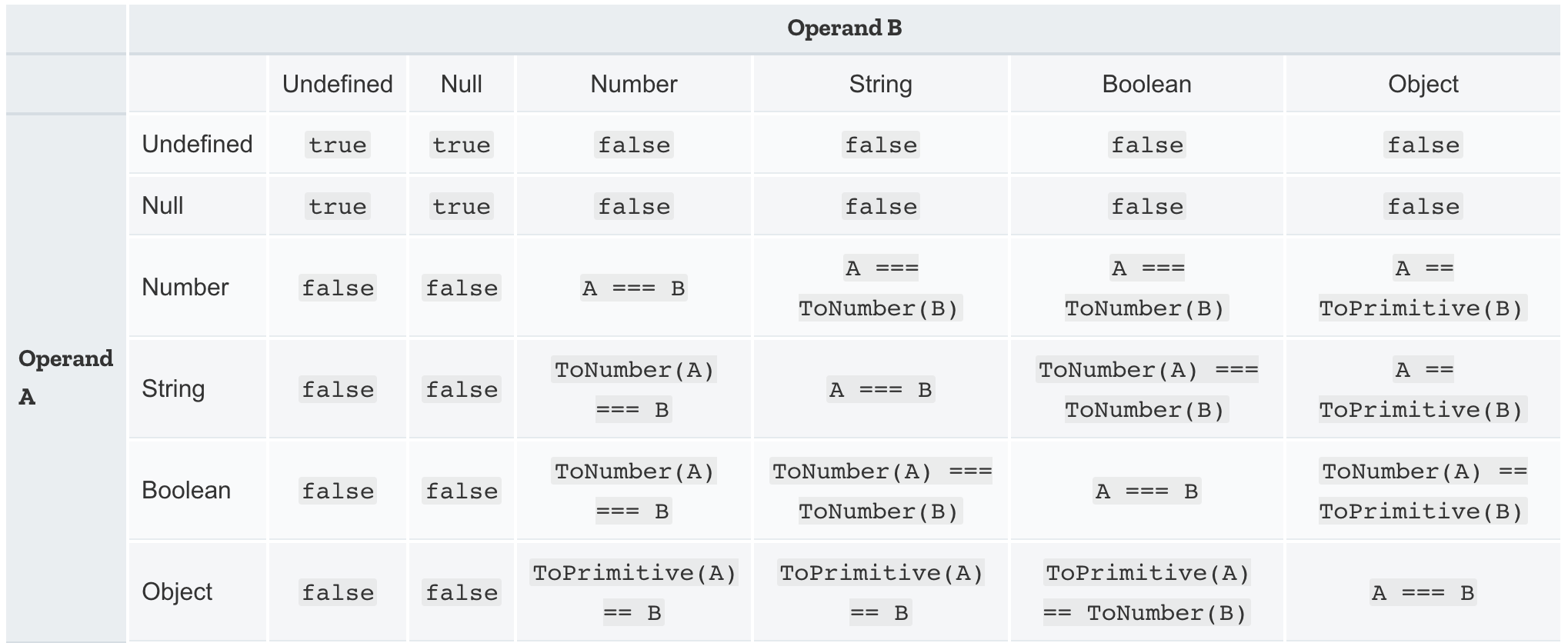3번 예제는 Boolean와 String의 비교로 표를 따라가 보면 ToNumber(A) === ToNumber(B)이 적용된다는 것을 확인할 수 있습니다. A인 true는 1로 , B인 'true'는 NaN이 되어 형 변환을 해도 둘은 동일하지 않은 값이 되는 겁니다다른 예제들도 형변환 비교표를 통해서 확인할 수 있습니다.